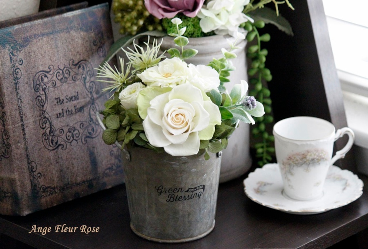 ナチュラルテイストたっぷり♪プリザーブドフラワーブリキアレンジWhite*GreenFlower
