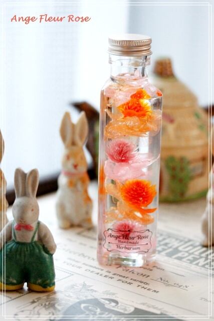 新作のプリザーブドフラワーの千日紅を使い、ピンクとオレンジ色で春爛漫なハーバリウムを作成しました。