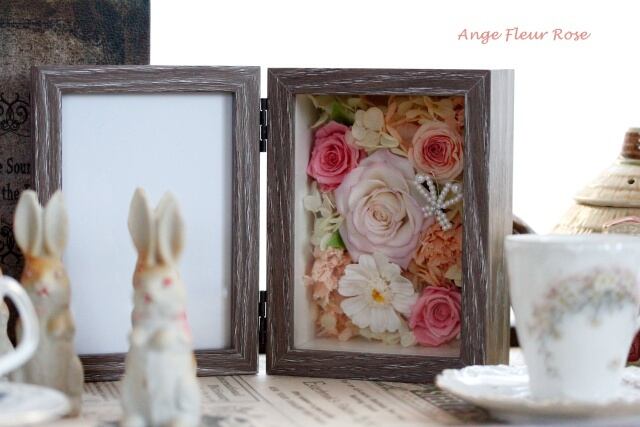 こちらは、プリザーブドフラワーローズ、ジニア、カーネーション、アジサイを使い、お花畑のような、明るい可愛らしいフォトフレームアレンジメントです。