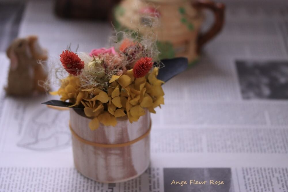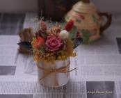 プリザーブドフラワーとドライフラワーを使用し、シャビーシックな雰囲気です。