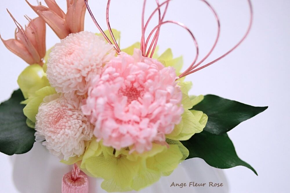その他、プリザーブドフラワーのアジサイ・アイビー、ドライフラワーニゲラオリエンタスを使用しています。